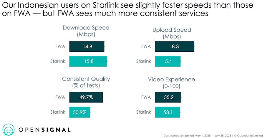 Dalam setahun kehadirannya di Indonesia, Starlink memberikan kecepatan unduh yang sedikit lebih cepat daripada FWA. Namun, FWA menunjukkan kinerja yang lebih baik dari layanan Starlink setidaknya dalam tiga metrik lainnya – terutama konsistensi kualitas, di mana nilainya hampir 50%, jauh lebih tinggi daripada hasil Starlink.