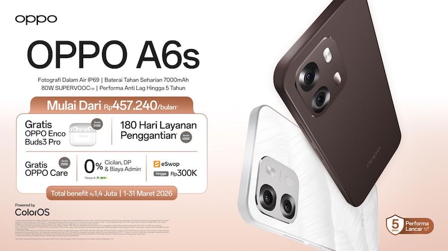 OPPO A6s juga memiliki kamera serbaguna yang ditopang oleh baterai besar, dan pengalaman ColorOS yang stabil hingga 5 tahun, OPPO A6s menjadi partner andal untuk menemani setiap momen, dari aktivitas outdoor hingga keseharian yang padat. OPPO A6s mampu bertahan dari debu, rendaman air, hingga semprotan air bertekanan tinggi dan suhu panas karena telah mengantongi sertifikasi IP69. Ketangguhan ini membuat OPPO A6s ideal digunakan saat hujan, di area outdoor, hingga aktivitas ekstrem tanpa rasa cemas.